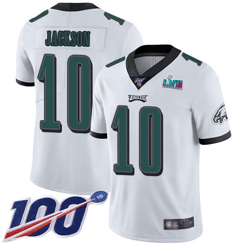 Exceptional Eagles #10 DeSean Jackson White Super Bowl LVII Patch Youth Stitched NFL 100th Season Vapor Limited Jersey Collectors this is a must have Add this Eagles jersey to your collection