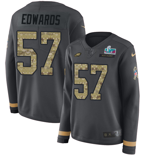 Superb Eagles #57 T. J. Edwards Anthracite Salute to Service Super Bowl LVII Patch Women’s Stitched NFL Limited Therma Long Sleeve Jersey Act fast Only a few left Secure your Eagles jersey today